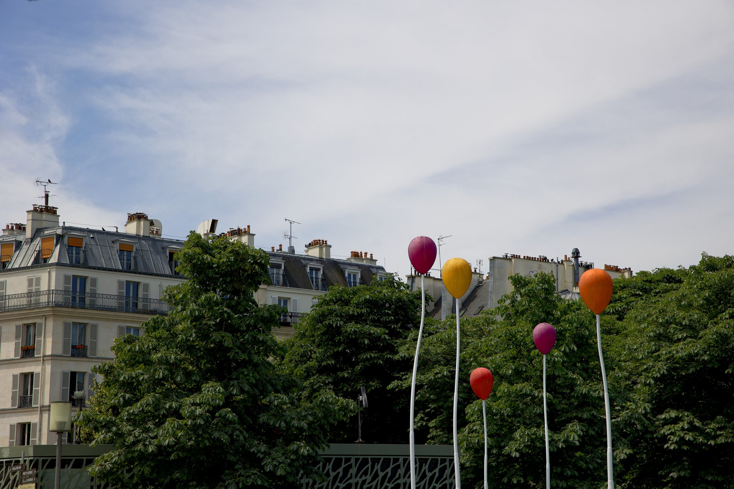 Place des Halles was previously the main marketplace where food from outside Paris was brought in and sold. As demand grew along with the city, the space became too small, so the marketplace was moved to Rungis in the suburbs of Paris. The Halles were changed into a public park and a shopping centre, continuing the tradition of trade there. The historical buildings surrounding the space have been preserved: the gothic church of Sainte Eustache, the Bourse de Commerce, and the traditional Haussman-style apartment buildings still stand today. These buildings interact with modern additions to the gardens, such as the sculptures of balloons above a children’s playground pictured here.