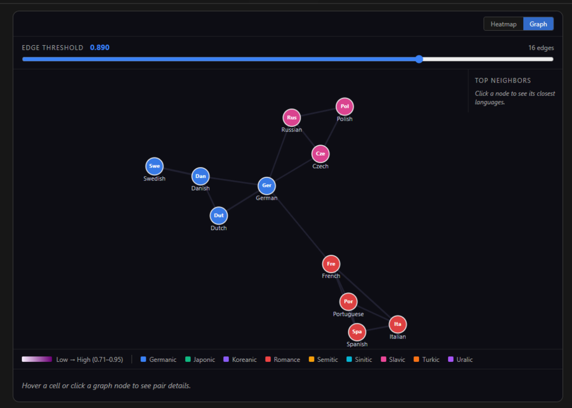 The map recovered a lot of the structure you would expect. Danish and Swedish sat very close together, and Spanish and Portuguese were strongly linked. French and Italian clustered closely. Across the network as a whole, links within the same language family were stronger on average than links across families. That suggests everyday translation still carries something of those deeper relationships.