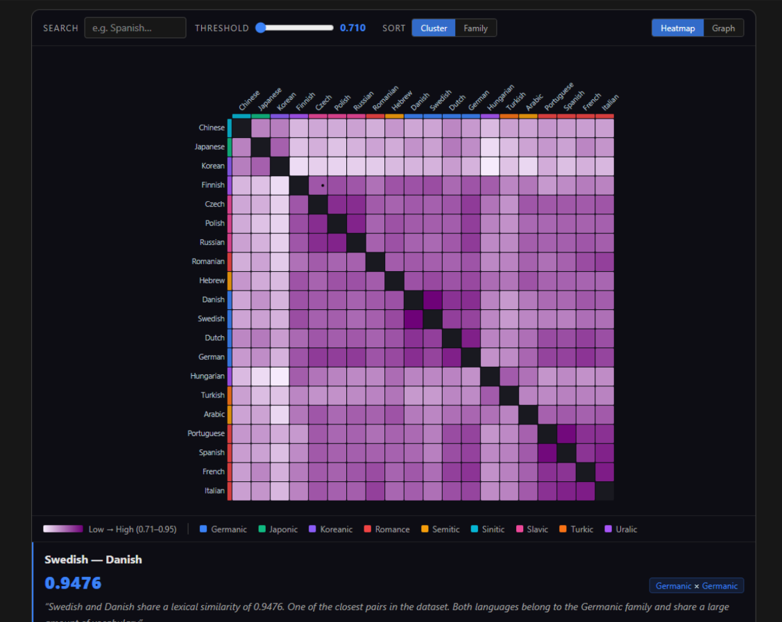 To build it, I used subtitle translation data from OpenSubtitles, via OPUS, a large open dataset of subtitle translations, across 20 languages. I looked at how each one tended to translate the same English words and phrases, then compared those patterns across languages. From that came two visualisations, both interactive tools on the SubSmith site. A heatmap, which arranges all 20 languages in a grid so you can see at a glance which pairs are most similar, and a network graph, which connects languages like a web and shows only the strongest links so the clusters are easier to spot. The heatmap is useful because it shows not just familiar clusters but the full spread of distance across all 20 languages. You can see where similarity is most concentrated, how tightly certain families pull together, and how far languages from different families tend to sit from one another.